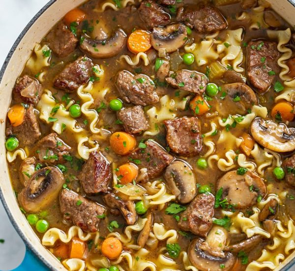 After cooking the onion and garlic, add cooked meat and warm it through before adding peas and kale.